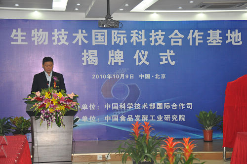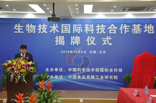 揭牌儀式上,靳曉明司長和陳鄂生董事長分別致辭。靳司長指出,科技的靈魂在于開放,食品行業(yè)作為國民經(jīng)濟(jì)的重要支柱產(chǎn)業(yè),技術(shù)的進(jìn)步離不開國際合作。希望以設(shè)立生物技術(shù)“國際科技合作基地”為契機(jī),積極參加國際科技合作交流活動,充分利用國際資源,進(jìn)一步挖掘潛力,引進(jìn)高級人才,使基地真正成為“技術(shù)領(lǐng)先、人才聚集”的國際科技創(chuàng)新中心。陳董事長要求,食品發(fā)酵院要深刻領(lǐng)會科技部《“十一五”國際合作規(guī)劃綱要》精神,緊密圍繞建設(shè)創(chuàng)新型國家的總體目標(biāo),切實提高自主創(chuàng)新能力,建設(shè)“項目基地人才”一體化的國際科技研發(fā)高地。蔡院長代表基地建設(shè)單位發(fā)表講話。